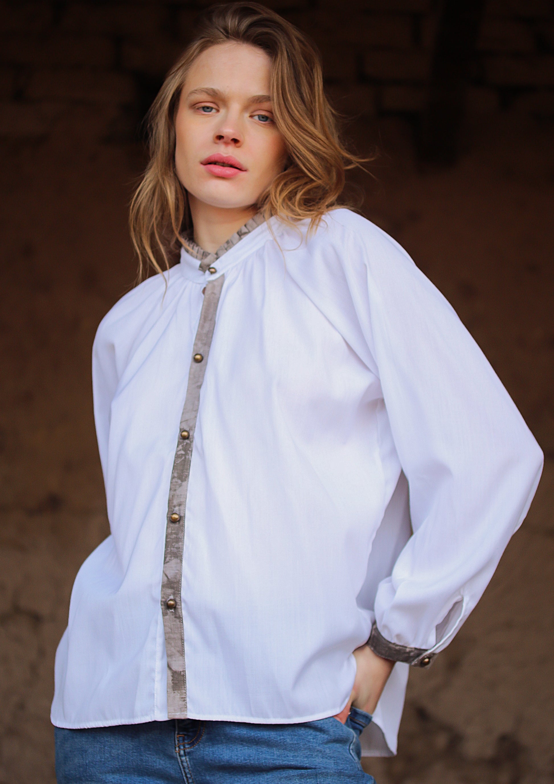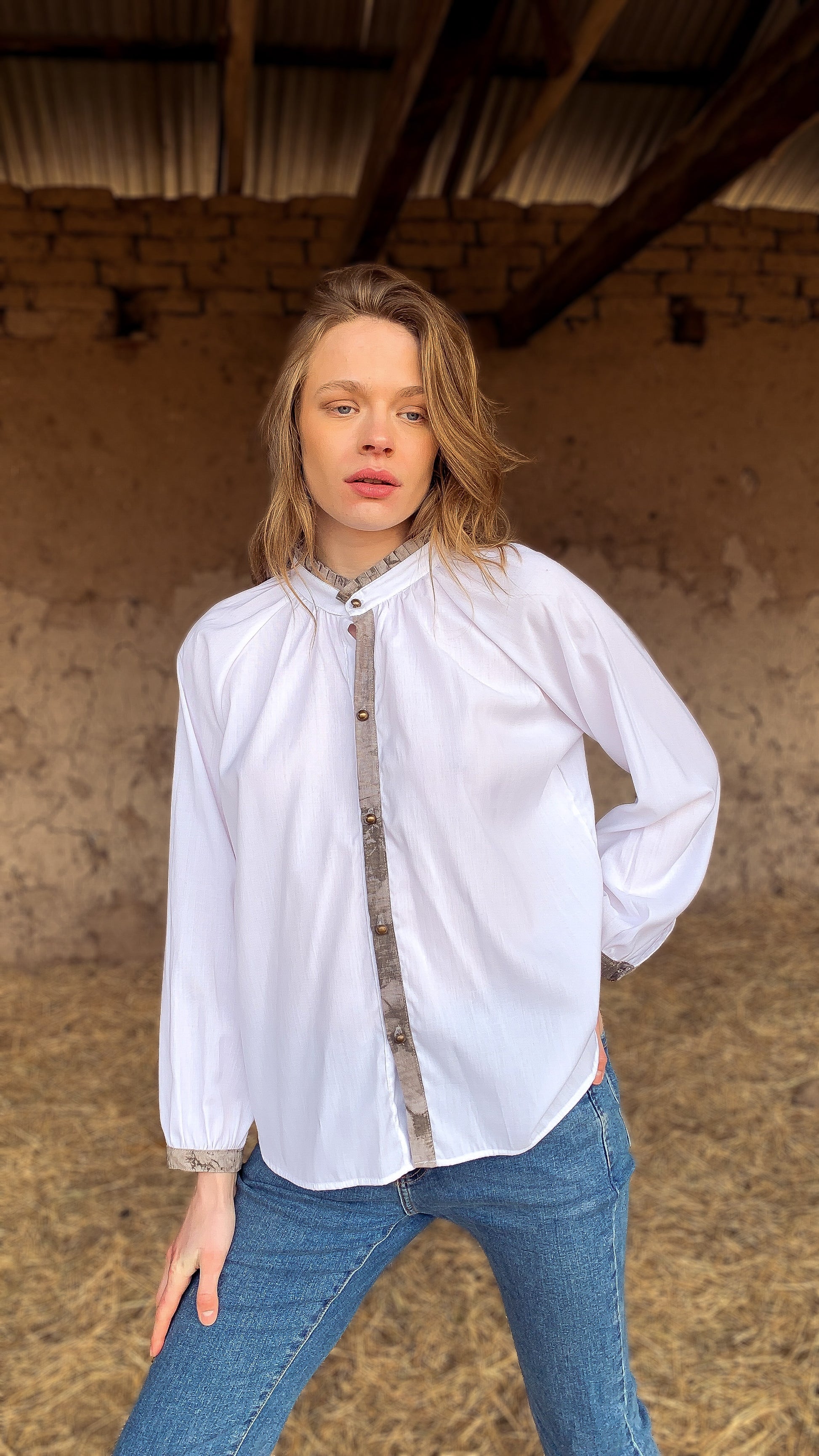 Nuestra blusa Tatio lleva un leve recogido en su cuello entablado y detalles en cruce y puños, que la convierten en una blusa única, original y cómoda.