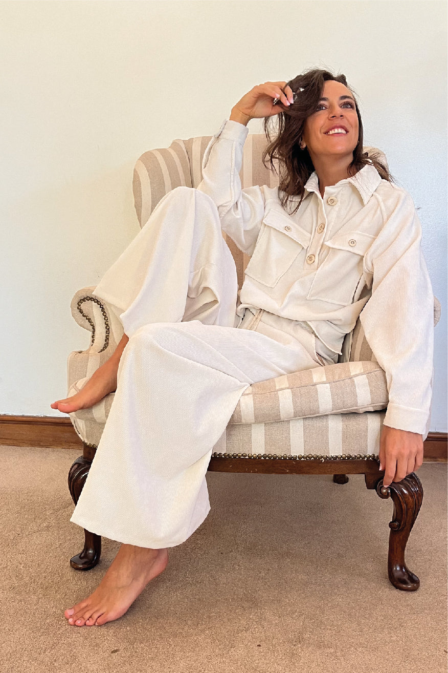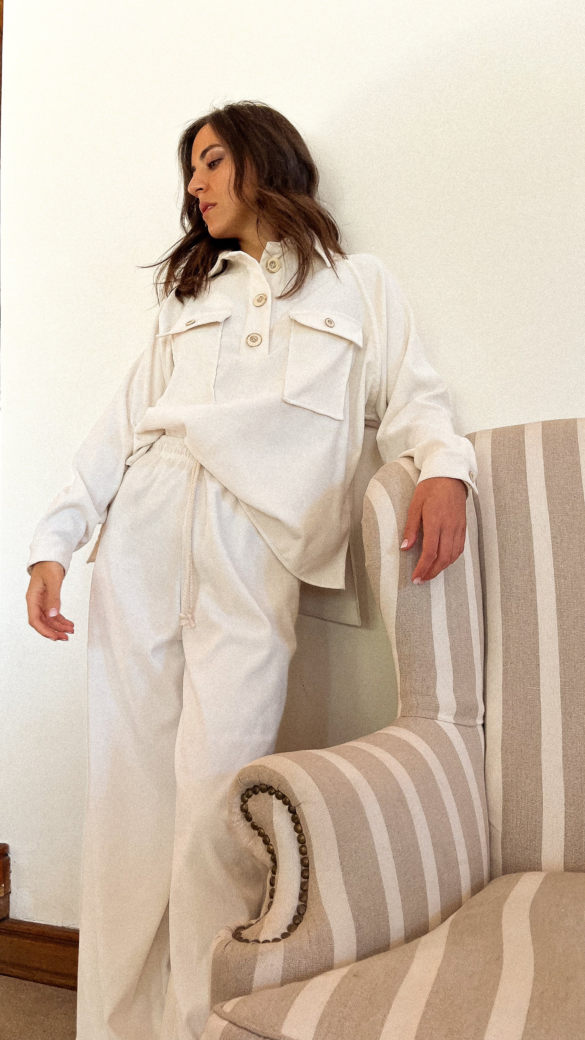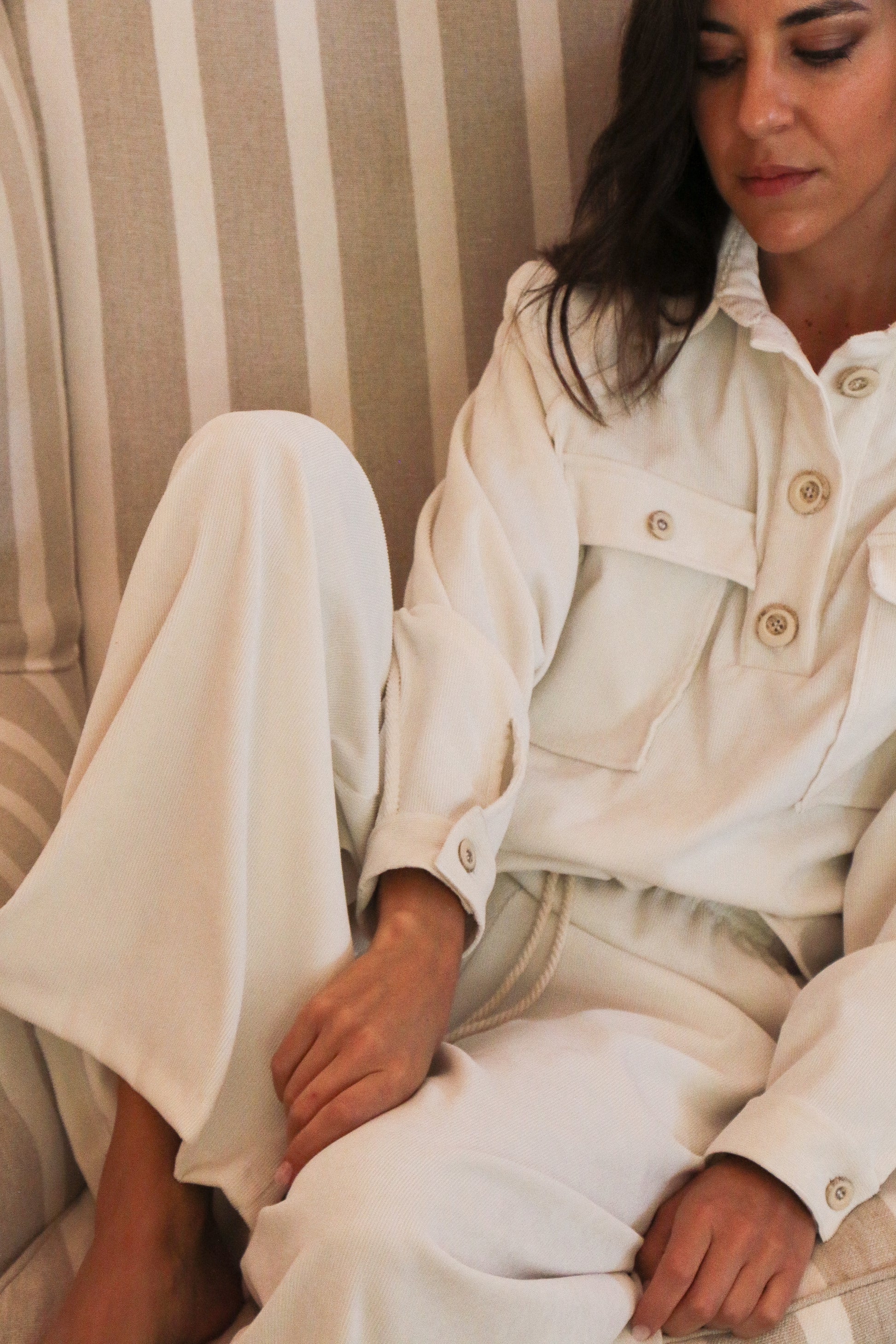 Nuestro conjunto Kala de cotelé es la elección perfecta para estar cómoda y con estilo en casa. Es ideal para estar preparada ante visitas inesperadas sin perder el estilo. Elegimos el color blanco crema para transmitir en ti paz y calma a lo largo del día, permitiéndote realizar tus actividades con serenidad.