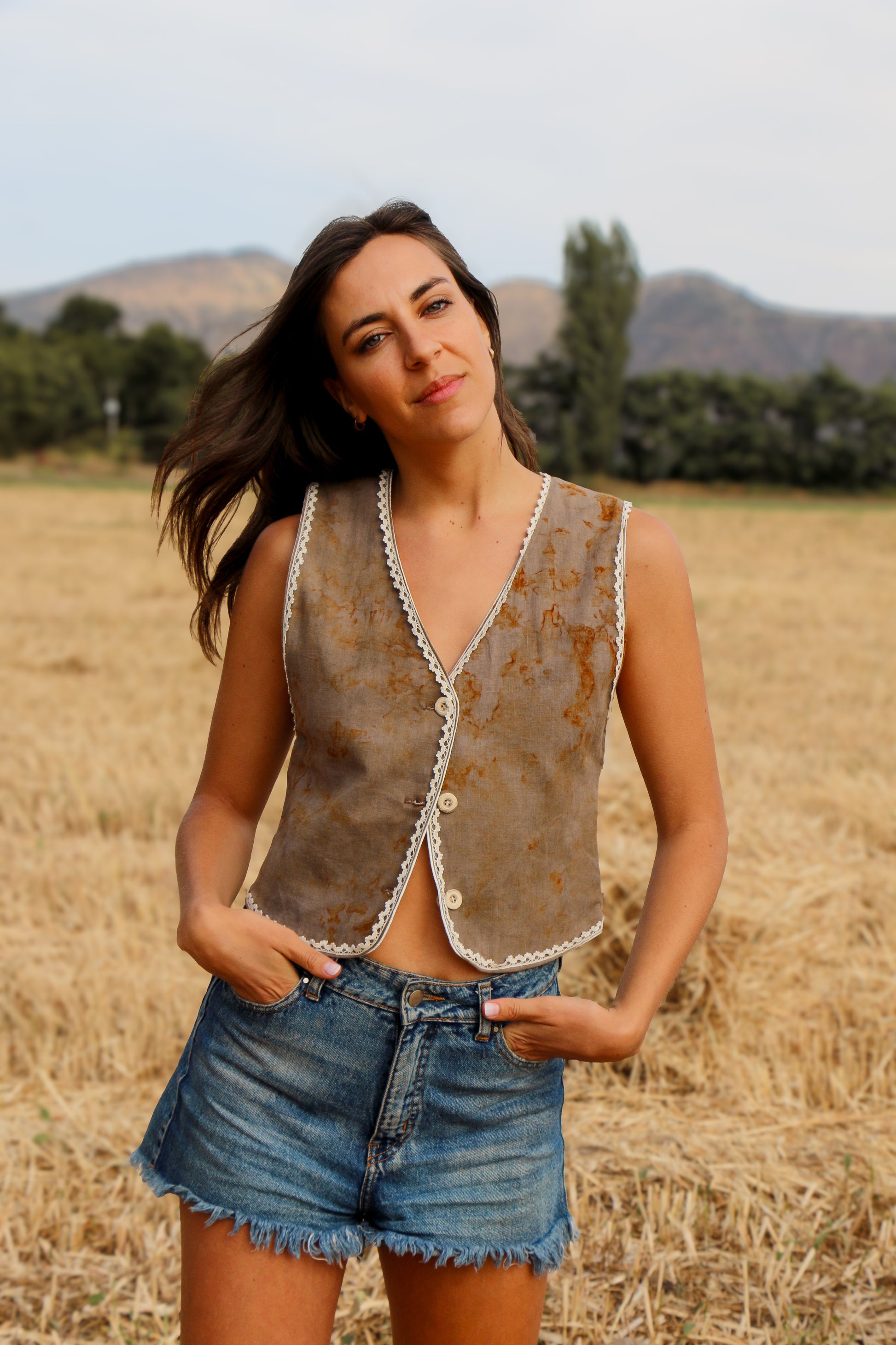 - Su estampado en tela 100% de lino, fue teñido delicadamente a mano con tintes naturales como el pelón de nuez, y sus colores en tonos marrón fueron logrados con óxido de tuercas viejas.
