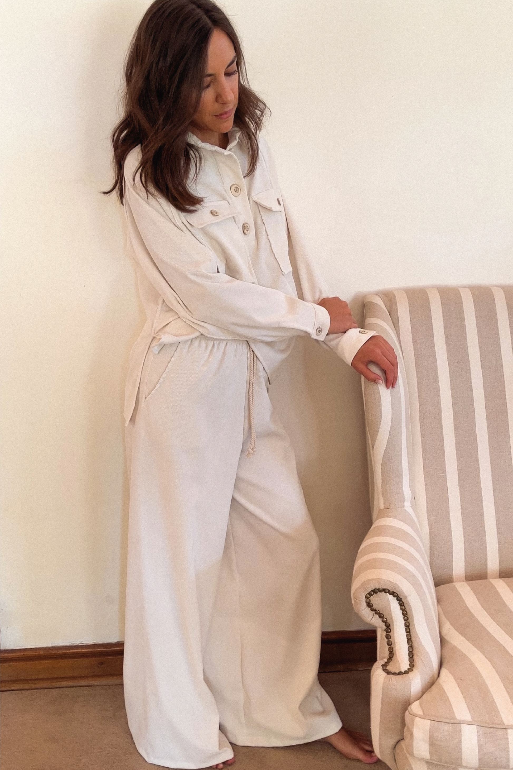 Nuestro pantalón Amaya, de diseño palazzo con caída suave y favorecedora, presenta una cintura elasticada que garantiza un calce perfecto y cómodo, adaptándose a tus movimientos con facilidad.